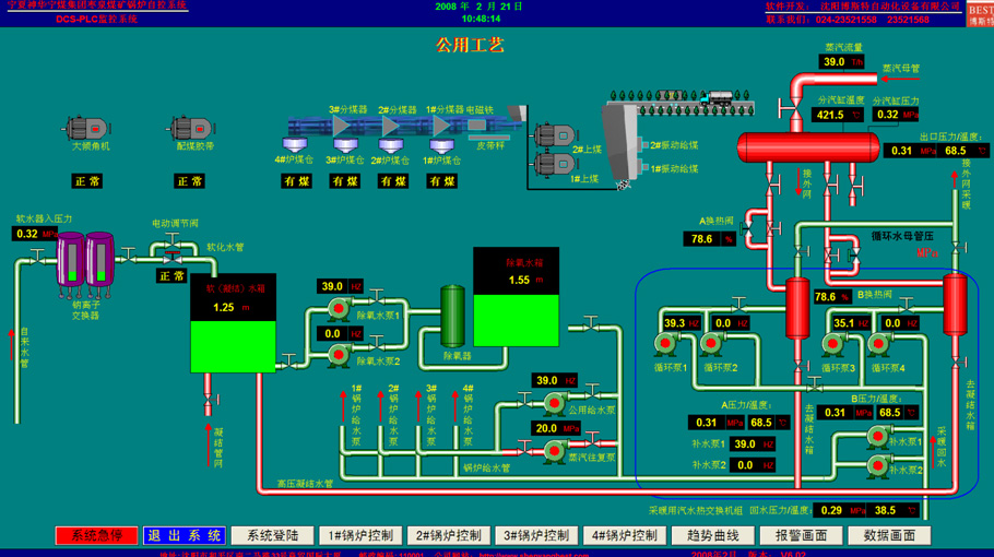 鍋爐節(jié)能自動控制系統(tǒng) 系統(tǒng)簡介: 在鍋爐控制系統(tǒng)中,我公司為實現(xiàn)節(jié)電、節(jié)煤、為滿足方便、快捷等客戶要求,為各種不同工作人員的不同使用方法和目的,開發(fā)出這套采用現(xiàn)場總線技術(shù)與本地控制技術(shù)相結(jié)合的控制系統(tǒng)——鍋爐節(jié)能自動控制系統(tǒng)。 此控制系統(tǒng)分為集中控制、遠(yuǎn)程控制和本地控制。故又稱為三地控制系統(tǒng)。 本地控制: 本地控制為變頻柜本柜控制。在本柜上可以進(jìn)行變頻器的啟停、調(diào)速、故障復(fù)位等操作; 遠(yuǎn)程控制 遠(yuǎn)程控制可以在遠(yuǎn)程控制臺上對已連接上的變頻器進(jìn)行啟停、調(diào)速等控制,同時通過儀表盤上的儀表顯示,可以直觀的知道各個檢測點的檢測值; 集中控制: 集中控制是由遠(yuǎn)程控制臺中的可編程控制器(PLC)通過通信電纜把所有變頻器及各檢測量的數(shù)據(jù)傳送到計算機(jī)中,可以在計算機(jī)中實現(xiàn)對整套系統(tǒng)的自動控制和手動控制。三地控制中可根據(jù)用戶的需要刪減其中的任意控制。 此自動控制系統(tǒng)中:本地控制中包含了部分自動控制和手動控制;遠(yuǎn)程控制中包含半自動控制和手動控制;集中控制中包含全自動控制和手動控制。各控制間切換方便、簡單。因系統(tǒng)是由計算機(jī)控制,調(diào)節(jié)精度大大提高,調(diào)節(jié)反映速度加快,能源節(jié)約率提高很多,特別是在節(jié)約電能方面,經(jīng)現(xiàn)實應(yīng)用比傳統(tǒng)的人工調(diào)節(jié)節(jié)約電能在30%以上,節(jié)煤也在3%以上,在此同時還滿足了各種不同工作人員所需的工作要求,大大減少了人員的工作強(qiáng)度,操作起來比以前人工操作時更準(zhǔn)確、方便、快捷。在現(xiàn)實應(yīng)用中受到廣大用戶的一致好評。 本地控制: 本地控制是變頻控制柜對設(shè)備直接進(jìn)行控制。本地控制中分為手動控制和自動控制。(此控制大多在調(diào)試階段、緊急故障時使用) 本地控制中手動控制是通過變頻控制柜上的控制按鈕直接控制相關(guān)設(shè)備。本地控制中的自動控制是一個閉環(huán)控制。它是從數(shù)據(jù)采集點采集的數(shù)據(jù)經(jīng)PID控制器處理后輸出一個控制信號給變頻器,在通過變頻器來控制相關(guān)設(shè)備。這套控制方案中的幾個主要閉環(huán)控制: 1、 鼓、引風(fēng)之間為爐膛微負(fù)壓閉環(huán)控制 2、 爐排、引風(fēng)之間為風(fēng)煤比控制 3、 循環(huán)水溫度閉環(huán)控制 遠(yuǎn)程控制: 遠(yuǎn)程控制是指在遠(yuǎn)程集中控制臺對系統(tǒng)內(nèi)的設(shè)備進(jìn)行控制。控制信號首先給入PLC,再經(jīng)PLC傳送到本地控制柜以此實現(xiàn)對系統(tǒng)內(nèi)設(shè)備的控制。此套控制減少了人員在幾臺控制柜之間的操作,節(jié)省人員。并且可以在操作盤上直觀的顯示各檢測點的數(shù)據(jù)。讓工作人員更方便的了解現(xiàn)場情況。 PLC和調(diào)節(jié)器穩(wěn)定性比較高。而且都有手/自動無擾切換(PLC可通過編程實現(xiàn));一般來說手動操作無論在調(diào)試階段還是應(yīng)急狀態(tài)下,都是最可靠、有效的手段 集中控制: 鍋爐集中控制系統(tǒng)是PLC和調(diào)節(jié)器通過PPI總線或485總線與中央處理計算機(jī)通訊,把控制輸出信號傳輸回組態(tài)軟件,同時接受組態(tài)軟件(工控機(jī))的指令。利用先進(jìn)的組態(tài)軟件編輯出工礦畫面,通過CRT直觀顯示各鍋爐及附屬設(shè)備等工況模擬圖、曲線及測點參數(shù),對水、煤、電的耗量進(jìn)行累計,且具有定時/即時打印鍋爐的各項運(yùn)行參數(shù)等功能。該系統(tǒng)可直觀、顯著的提高管理水平,提高鍋爐的熱效率,節(jié)約燃料、水量和電能 變頻通訊內(nèi)容為: (1) 過程控制方面: 因為是三地控制,所以在三地中的任何一地都可以實現(xiàn)對整套系統(tǒng)的控制,可實現(xiàn)變頻的起動、停止、積分發(fā)生器的設(shè)置以及頻率或轉(zhuǎn)矩的設(shè)定等。 (2) 數(shù)據(jù)采集方面: 變頻的輸出頻率、電機(jī)電流、輸入電壓、變頻器輸出電壓、給定信號、實際信號、工作狀態(tài)等電氣量都可以被監(jiān)控。 其他的數(shù)據(jù)如(溫度、壓力、流量等)也是時時采集。這些數(shù)據(jù)不但可以在遠(yuǎn)程控制臺上可以時時顯示,在遠(yuǎn)端的工控機(jī)上也可以時時顯示,并能儲存和打印這些數(shù)據(jù) (3) 故障診斷方面: 可靠和準(zhǔn)確的故障診斷信息可以通過報警和故障代碼獲得,這樣可以減少變頻的停機(jī)時間和停產(chǎn)時間。 鍋爐自動控制功能: 1. 爐膛負(fù)壓控制 2. 燃燒控制 3. 引風(fēng)控制 4. 鼓風(fēng)控制 5. 爐排控制 6. 給煤控制 7. 鍋爐循環(huán)泵控制 8. 外網(wǎng)循環(huán)泵控制 9. 補(bǔ)水泵控制 10. 軟水箱液位控制 鍋爐熱保護(hù)功能: 1. 供水壓力保護(hù) 2. 出水溫度保護(hù) 3. 汽包壓力保護(hù) 電氣保護(hù)功能: 1. 各控制間聯(lián)鎖保護(hù) 2. 鼓、引風(fēng)聯(lián)鎖保護(hù) 鍋爐數(shù)據(jù)監(jiān)測功能: 3. 循環(huán)泵聯(lián)鎖保護(hù) 1. 各風(fēng)機(jī)水泵運(yùn)行情況 2. 爐膛溫度 3. 爐膛負(fù)壓 4. 煙氣溫度 5. 煙氣含氧量 6. 出水溫度 7. 回水溫度 8. 出水壓力 9. 回水壓力 10. 外網(wǎng)回水